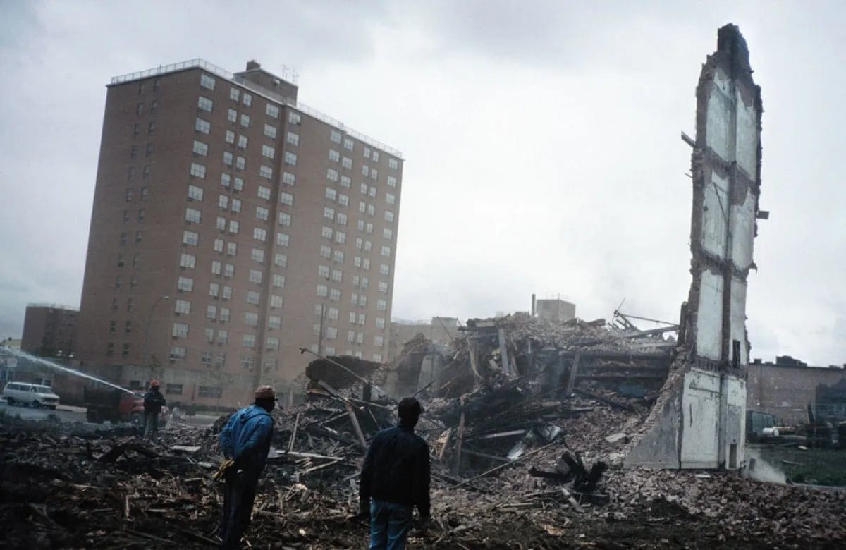 SoHo──今はハイブランドのブティックやギャラリーが並ぶショッピングエリアとして有名ですが、1950年代、この地域は消防局長の Edward F. Cavanagh Jr. が「地獄の百エーカー(Hell’s Hundred Acres)」と呼んだ、危険で汚く、火災が頻発する荒廃した工業地帯の一角でした。古いビルが立ち並び、倉庫や工場が密集し、夜になると人通りもほとんどない危険な場所と見なされていたのです。後にSoHoとして知られることになるハウストン・ストリートの南側は、とりわけ繊維・縫製工場が集まる地区でした。1962年の時点で、わずか40ブロックほどの地域に650社以上の製造業や倉庫業者が入っていたと言われています。